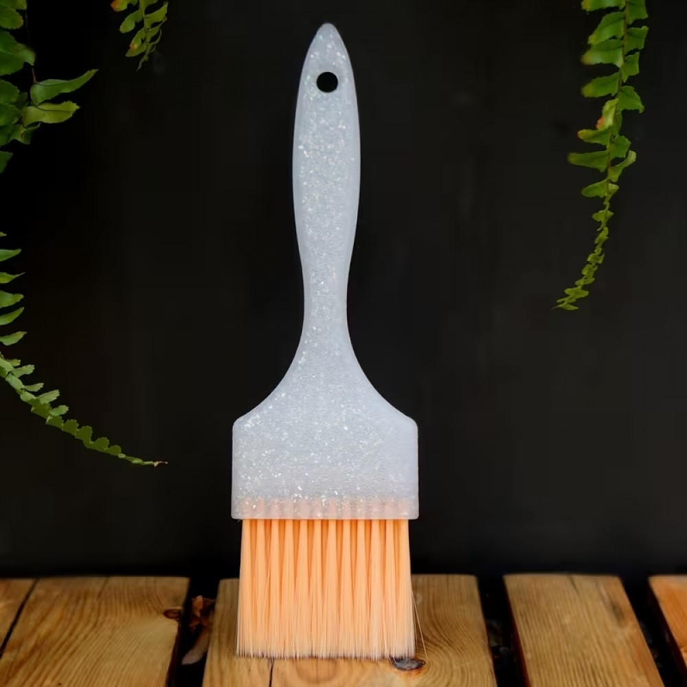 Пензель з шириною ворсу 5 см та довжиною 4 см має універсальний розмір для різних технік. Робоча частина з м’якими нейлоновими щетинками з потонщеним кінчиком, комфортна для шкіри голови. Антиковзка льодяно-біла ручка з блискітками. Ворс помаранчевого кольору.